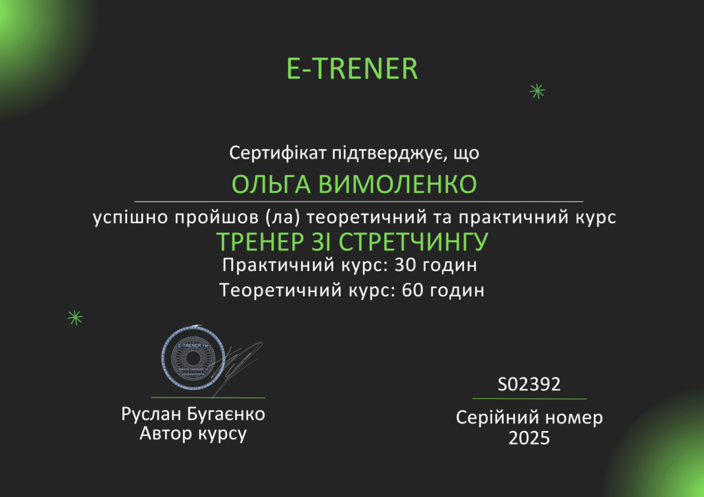 ✅ Міжнародний сертифікат — підтвердження кваліфікації тренера зі стретчингу, яке визнають у фітнес-клубах України та Європи.
