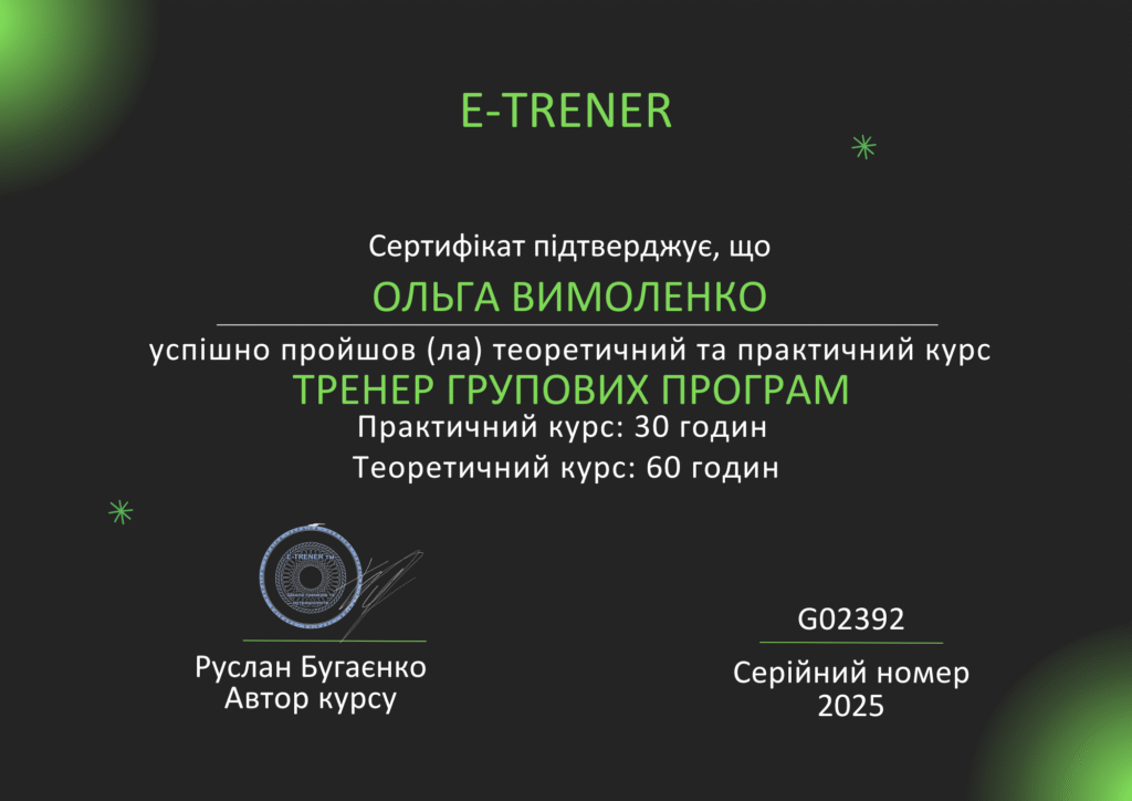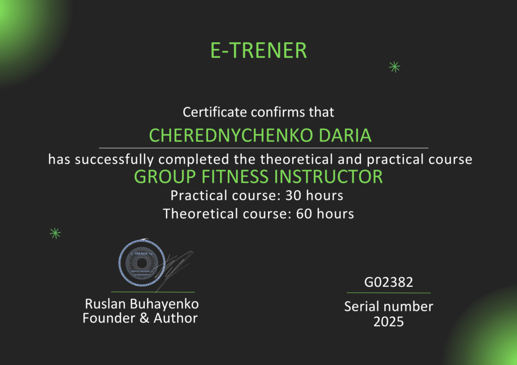 Після завершення курсу ви отримаєте сертифікат, який підтверджує вашу кваліфікацію та визнається у фітнес-клубах України та Європи. Це відкриває двері для кар’єри тренера групових програм, власних студій або онлайн-занять.